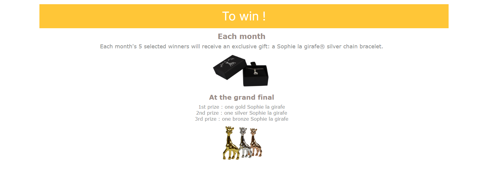 Each month's 5 winners will qualify for the grand finale that will take place during the month of January 2026, which will elect the 2025 Sophie la girafe® baby.
