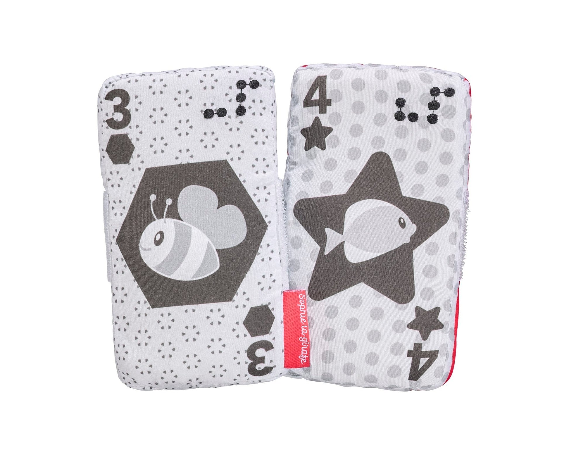A wide range of activities to stimulate the senses : Taste : a teething ring to chew and release baby's painful gums. Hearing: a squeak, a bell, a rattle and crunched paper to keep baby entertained. Touch: 6 different textures to discover. (minky dots, corduroy, cotton gauze ) Sight : a brightly coloured side and a black and white side to attract attention and awaken the eye