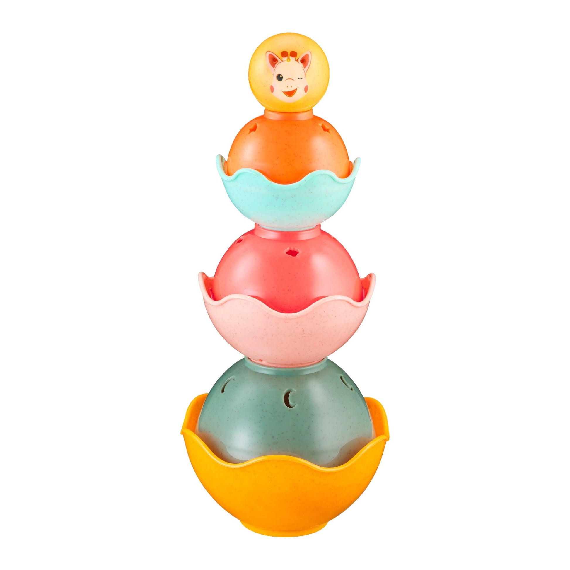 6 colourful stacking bowls forming a pretty pyramid decorated with a sound ball with the effigy of Sophie la girafe®